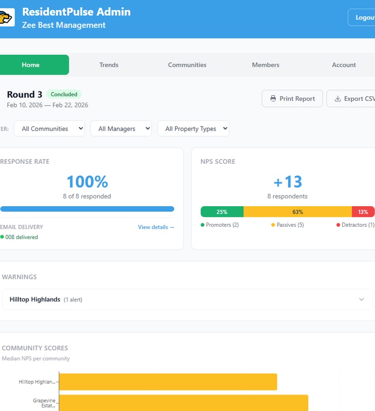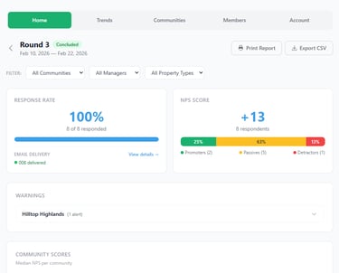 You get a live dashboard with NPS scores, sentiment trends, AI-generated insights, and critical alerts — so you always know where you stand with every community in your portfolio.
